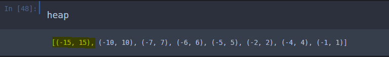 튜플을 활용한다. 아래와 같이 원래 숫자를 음수화하여 튜플의 앞쪽에 배치하면 원래 순서의 역순으로 정렬이 가능하고, heap은 별 다른 조건이 없으면 튜플의 앞 숫자를 기준으로 먼저 정렬함을 이용한 것이다. 가장 큰 값이 heap[0]임을 알 수 있다.