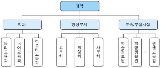 각 칸을 노드(node), 포인터를 엣지(edge), 그리고 트리의 최상위 정점은 뿌리(root)라 부르며, 노드간 상하관계를 부모자식관계로 표현한다. (학과의 자식 노드는 윤리교육과, 국어교육과, ... 컴퓨터교육과의 부모노드는 학과)