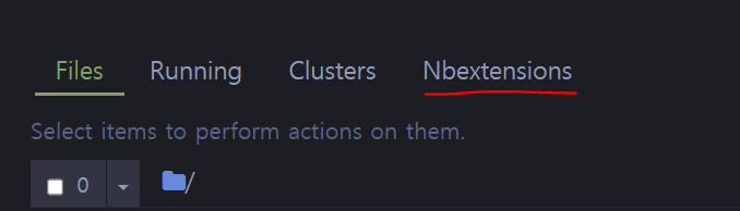 위 코드를 실행하고 나면, jupyter notebook 홈에 다음과 같이 Nbextensions가 생긴다.