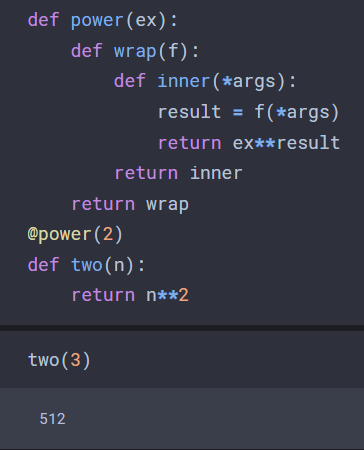 데코레이터가 없었다면 two(3)는 9를 출력하겠지만, @power(2)라 표현함으로써 power 함수의 변수인 ex에는 2가 할당되고, power의 내부에서 정의되는 wrap함수의 변수인 f 자리에 뒤이어 나오는 two(n) 함수를 변수로 집어넣게 된다. inner함수는 f가 받은 것과 동일한 args들을 할당 받아 실행되어, result에는 3의 제곱인 9가 답기고 결과적으로 2의 9승인 512를 출력하는 코드가 된다.