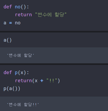 파이썬의 함수는 일급 객체로(first-class object: 일반 객체에 적용 가능한 모든 연산이 지원되는 객체) 함수 자체를 변수에 할당하거나, 또 다른 함수에 변수로 집어넣는 것 등이 모두 가능하다.