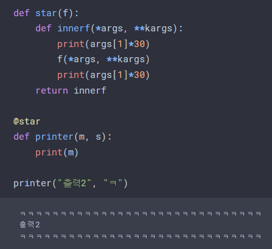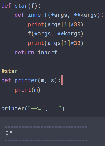 위와 같은 코드가 있다면, @star를 선언했으므로, star의 variable인 f 자리에 printer라는 함수가 할당된다. 이후 innerf라는 함수는 f가 받아온 변수를 그대로 이어 받아(*args -> args에 "출력" , "=" 저장) 가진 뒤 실행된다.