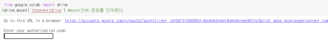 drive.mount('/content/drive') #mount안에 경로를 던져준다.