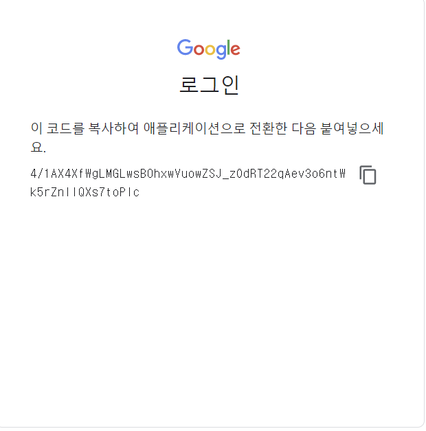 이렇게 링크가 나오면, 연결하고자 하는 구글 드라이브를 보유한 아이디로 로그인 한 뒤 아래처럼 코드를 받아 입력하면 된다.