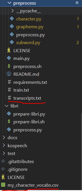 이러한 전처리 및 단어 사전 만들기와 관련된 파일은 모두 'kospeech-latest/dataset' 안에 포함돼있다. 나는 kspon 데이터로 학습된 과정만 계속 따라가며 프로젝트를 진행했다. 'kospeech-latest/dataset/kspon'에 readme를 읽어보면 어떤 데이터를 사용했는지, 전처리는 어떤식으로 진행하면 되는지가 설명이 꽤 자세히 되어있다. 결국 알아야하는 내용은 두 가지 정도다.