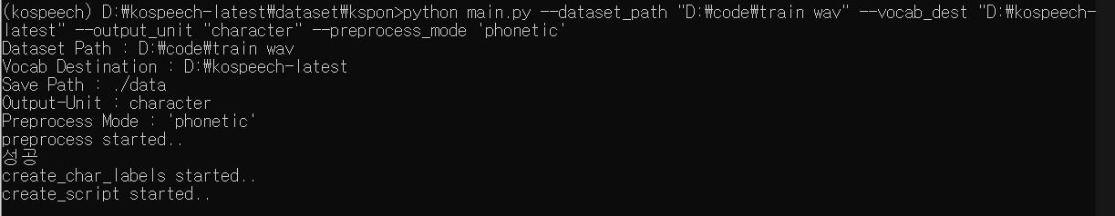 python main.py --dataset_path "D:\code\train wav" --vocab_dest "D:\kospeech-latest" --output_unit "character" --preprocess_mode 'phonetic'
