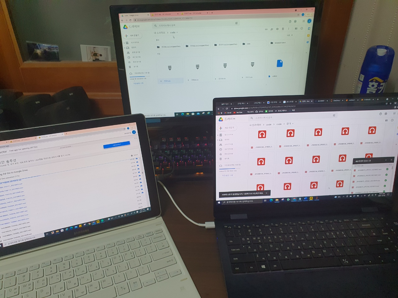 개인적으로 이때가 기억에 많이 남는다ㅋㅋ. 30만개의 데이터(zip 파일로 약 90GB)를 웹 상의 구글 드라이브에서 한 번에 unzip 하는 것은 어림도 없었다. 웹브라우저는 상대적으로 다룰 수 있는 데이터의 크기가 작아서, 10000~15000개 정도의 파일만 구글 드라이브에서 제공하는 기능으로 unzip이 가능했다(이를 파악하는 데도 수일이 걸렸다.). 처음엔 손으로 500개씩 올리다가 이건 아니다 싶어 데이터를 30등분하여 zip하고 구글 드라이브에 올리고 unzip을 반복했다.