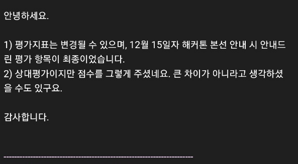 평가지표가 맨 처음 안내된 것과 달리 진행되었는데, 1)이야 그렇다 치자. 뭐 자기들 맘대로 바꿨지만 공지했으니까.. 근데 2)는 진짜 웃음벨이다. 평가지표 중 알고리즘 부문의 20점은 중간 평가의 결과가 상.대.평.가.로 반영되는 것이었다. 중간 평가에서 우리가 1위였고, 이는 중간 평가 결과가 반영되는 20점에서 우리가 상.대.적.으로 1위의 점수를 받아야하지 않나? 한 평가자는 우리와 대상을 받은 팀에게 저 항목에서 동일한 18점을 부여했고, 우리는 최종 3점 차이로 대상을 놓쳤다. 어떻게 모델 개발이 중요한 하나의 축인 대회에서, 상대 평가를 하는데 30만개를 다 학습한 팀과 4만개도 채 학습시키지 못한 팀이 동일한 점수를 받을 수 있으며, 큰 차이가 아니라고? 성능도 최소 4배는 차이났을텐데?