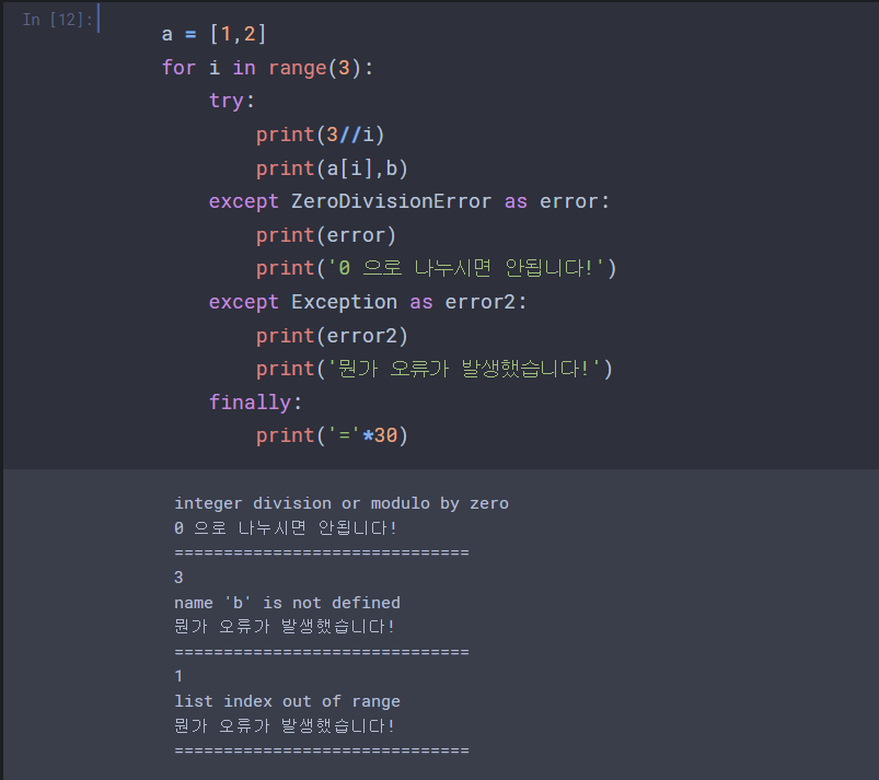위처럼 일단 try 구문을 시도하여 문제가 발생하지 않으면 그대로 실행하고, 예외가 발생하면 except 구문의 지시에 따른다. 발생하는 예외의 종류에 따라 어떻게 처리할 지 여부를 except 구문에 포함시킬 수 있으며, 예외의 종류에 관계없이 Exception으로 모든 예외를 받을 수도 있다.(혹은 따로 적지 않아도 마찬가지다.) 다만 모든 에러를 Exception으로 받아버리면 사용자가 어떤 에러인지 알 수 없는 문제가 있으므로, 해당 방법은 지양하는 것이 좋다.