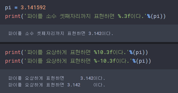 마찬가지로 정렬과 padding이 가능한데, 여기서는 아까와 달리 .3을 활용했을 때 소수 셋째자리에서 반올림을 진행한 결과가 나온다.