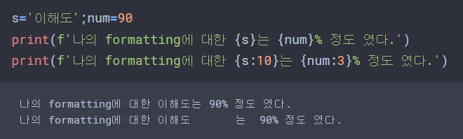 웬만한 경우는 %s를 사용해 해결할 수 있고, 위 예시처럼 직접 %를 str으로 입력하고 싶은 경우 일종의 escaping으로 %를 하나 더 달아주어야 한다.
