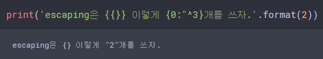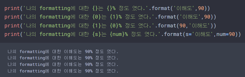형식만 조금 다를 뿐 % formatting과 거의 유사하다. formatting하고자 하는 위치들을 {}로 표현하며 index를 부여하거나 key 값을 부여하고, 해당 index 혹은 key에 들어갈 값들을 뒤에 달아준다.