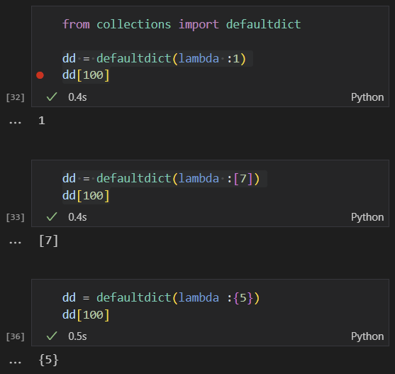 이 역시 dict.get()을 적절하게 활용하면 없이 해결할 수 있긴 하지만, dict에 존재하지 않을 수 있는 값에 대해 int(0), list([]), set({}) 등의 빈 값들을 적절하게 default로 지정할 수 있다는 장점이 있는 자료구조다.