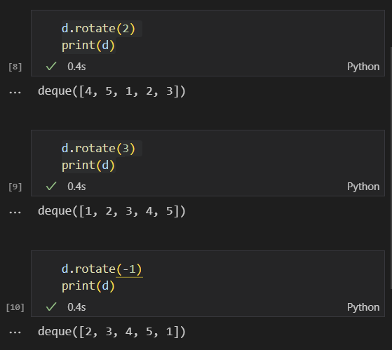 일반 리스트가 제공하는 append, pop, extend를 포함한 attrubure 뿐만 아니라 appendleft, popleft, extendleft 등도 제공한다. 추가로 rotate이라는 것을 지원하는데 아래와 같이 작동한다.