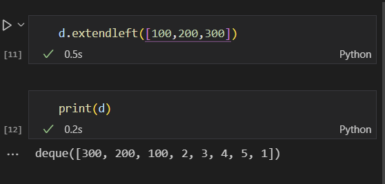 extendleft()의 경우 다음과 같이 작동하는데, 왼쪽에 붙일 때는 입력한 순서의 반대로 붙는 것을 알 수 있다. 이는 stack자료 구조의 LIFO, queue 자료 구조의 FIFO이 제대로 작동할 수 있도록 한다.
