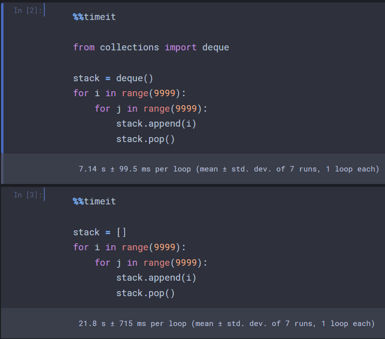 %%timeit은 주피터노트북에서 해당 셀에 대한 실행을 여러 번 반복했을 때 평균적으로 걸리는 시간을 계산해주는 매직 명령어이다. 이를 통해 deque()와 일반 리스트에 원소를 넣다 빼는 행위의 걸리는 시간을 비교해보면 아래와 같다.