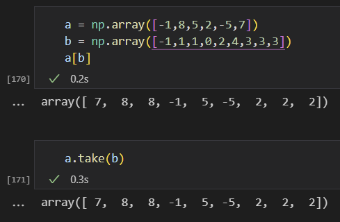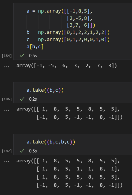 위처럼 2차원 행렬에 대해 b,c를 index로 던지면 순서대로 (0,0), (1,1), (2,2) ... (2,0) 위치의 원소들을 담은 배열을 반환한다. array.take()에 같은 길이의 index를 담은 배열을 tuple로 담아 던지면 해당 index들로 만들어낸 배열을 순서대로 담은 array를 반환한다.