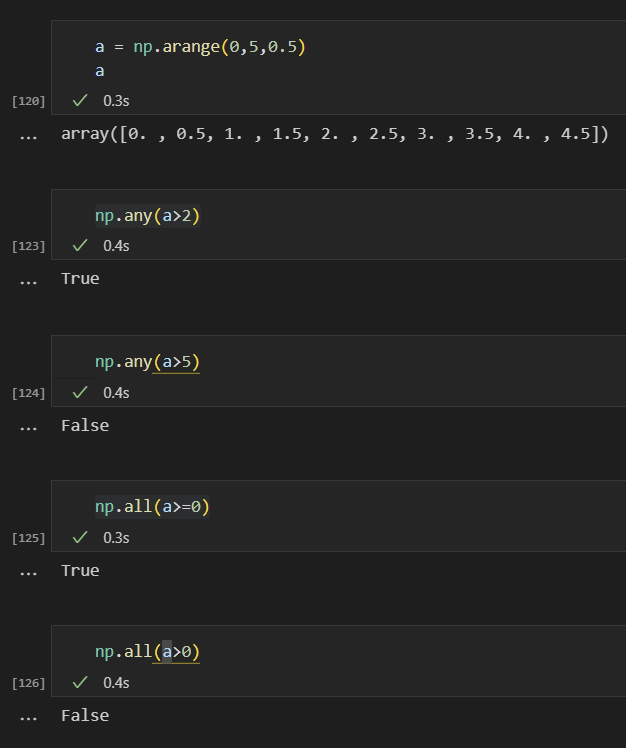 all은 각각 원소에 비교 연산을 진행하여 모두 참이면 True, 그렇지 않으면(하나라도 거짓이면) False를 반환한다.