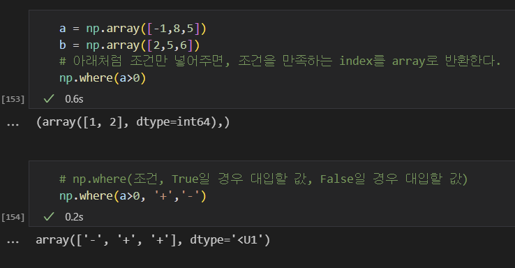 np.where을 활용하면 특정 조건을 만족하는 index들을 구하거나, 조건을 만족하는지 여부에 따라 각 index에 특정 값을 넣은 같은 shape의 array를 만들 수 있다.