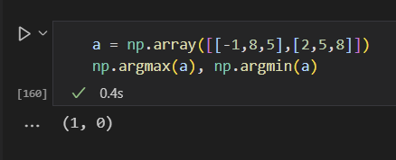 np.argmax()와 np.argmin()은 element 중 최댓값과 최솟값의 index를 반환한다. list와 유사하게 최대 혹은 최소의 값이 여러 개라면 가장 작은 index를 반환한다.