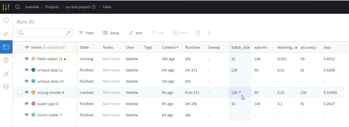현재는 클릭해도 Quick Start 외에 없지만, 코드로 기록을 시작하면 그 결과를 해당 project 내에서 확인할 수 있다. 아래는 사용 화면 예시다.
