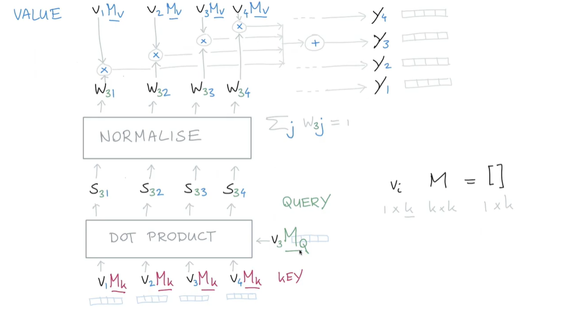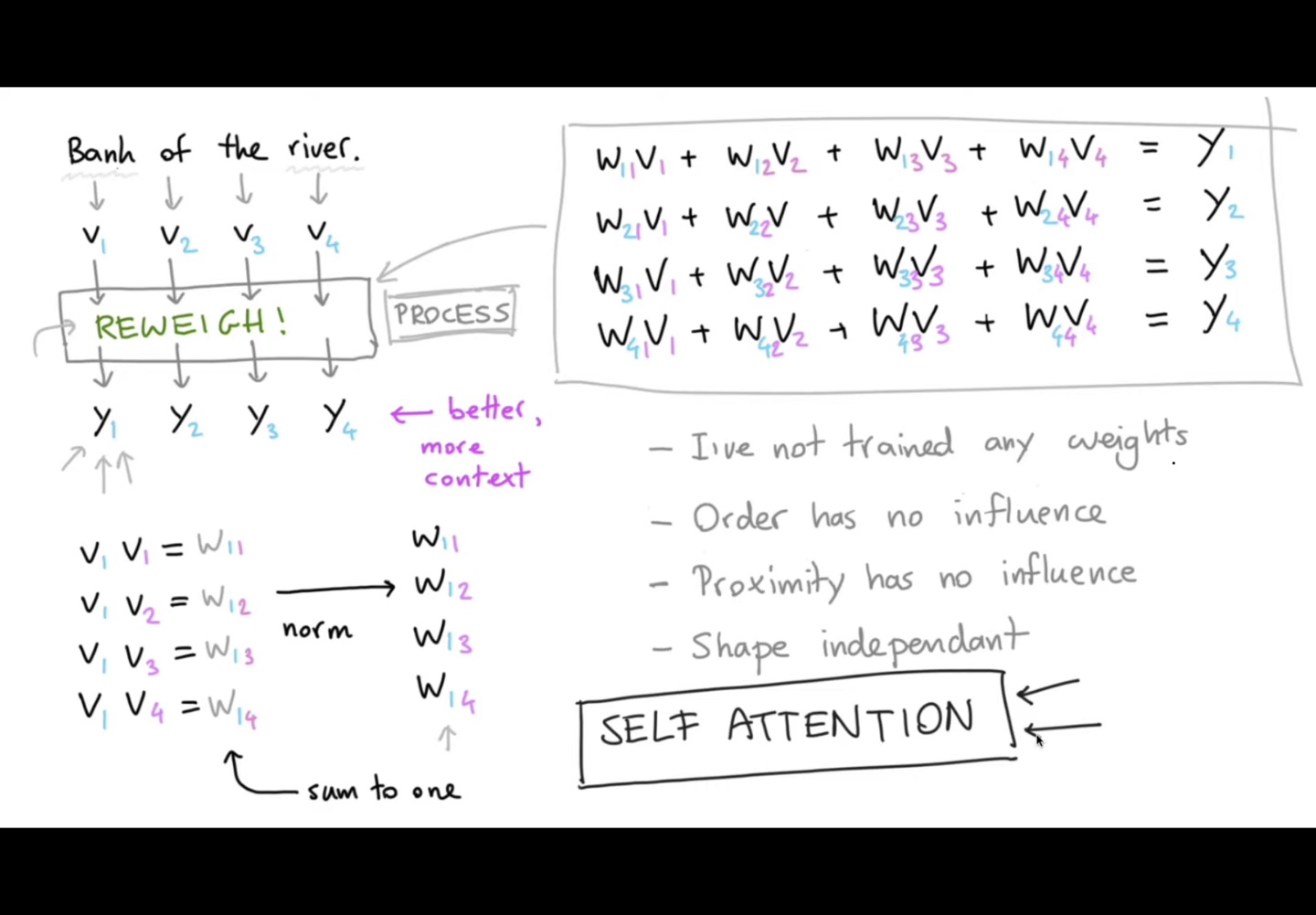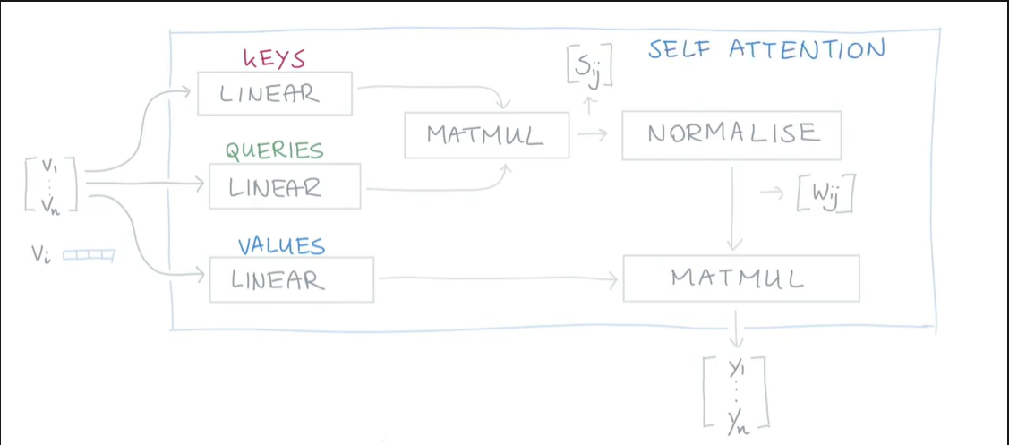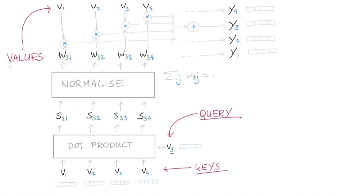 v1~v4는 임베딩된 벡터이고, 우리는 일련의 과정을 통해 보다 문맥적 의미를 가진 y1~y4의 임베딩 벡터를 만들어내는 것이 목적이다. 이때 위의 예시처럼 각 v1~v4의 차원마다 특정 의미가 있을 것이고, 주의를 기울여야 할 단어들 간에는 각 차원마다의 유사성이 있을 것이라는 가정 하에 v1~v4 각각에 자기 자신을 포함한 모든 단어들을 내적한 결과를 구한 뒤, softmax를 통과시켜 일종의 확률로 표현한다. (w_1i의 총합은 1이 될 것이다.) 이때 위 사진의 예시에서는, v1과 관련이 있을수록 w_1i의 값이 크게 표현될 것이다. 이렇게 구한 w_1i들과 v1~v4를 이용해 y1을 구하면, 다른 모든 벡터들의 영향력이 반영된 새로운 임베딩 벡터가 만들어지게 된다.