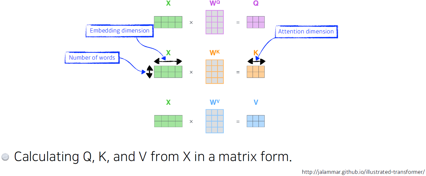 실제로는 아래 그림처럼 각 임베딩 벡터는 Key, Query, Value vector를 만들어내기 위한 Non-biased linear layer를 통과하는 구조이며, backpropagation을 이용해 업데이트 하는 방식으로 Key, Query, Value vector를 만들어내는 과정 자체를 학습할 수 있다.