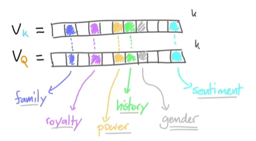워드 임베딩의 기본 가정은, 위의 예시처럼 임베딩된 벡터의 각 차원들이 일종의 '의미'를 가져 유사한 의미를 가지는 단어들은 유사한 벡터로 표현될 것이라는 점이다. Self-Attention 기법은 이를 활용해 reweighing weights들을 탐색한다.
