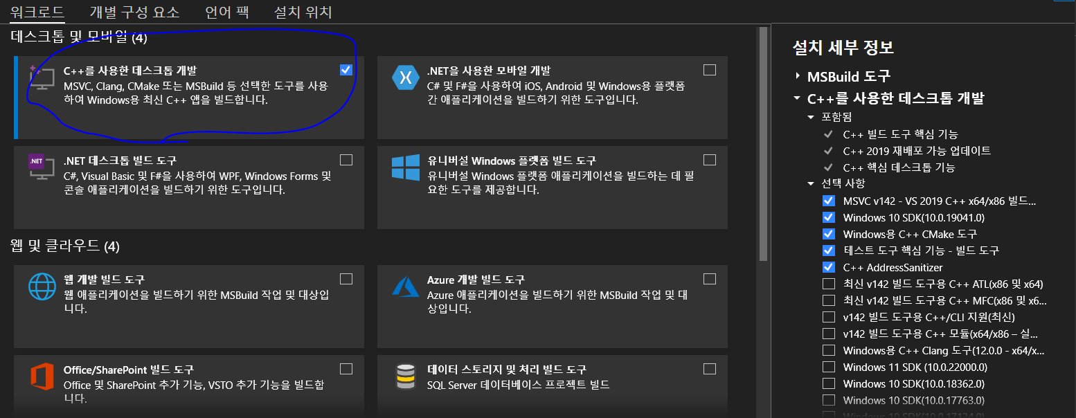 visual studio 설치 후 C++를 사용한 데스크톱 개발 툴을 추가로 설치하고 이후에 콘솔 창에 아래 명령어를 실행하면 된다.