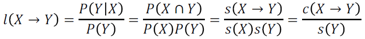 (𝑋가 포함된 transaction 가운데 𝑌가 포함된 비율) / (𝑌가 포함된 비율) 을 의미하여, lift = 1 이면 두 itemset 𝑋, 𝑌가 독립이고, 1로부터 멀수록 강한 상관관계를 가지는 것으로 해석할 수 있다. (lift > 1: 𝑋, 𝑌가 양의 상관관계 / lift < 1: 𝑋, 𝑌가 음의 상관관계)