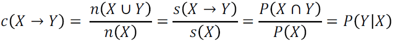 𝑋가 포함된 transaction 가운데 𝑌도 포함하는 transaction 비율로, 𝑌의 𝑋에 대한 조건부 확률과 같은 의미이다. confidence가 1에 가까울수록 유용한 규칙이라 해석할 수 있다.