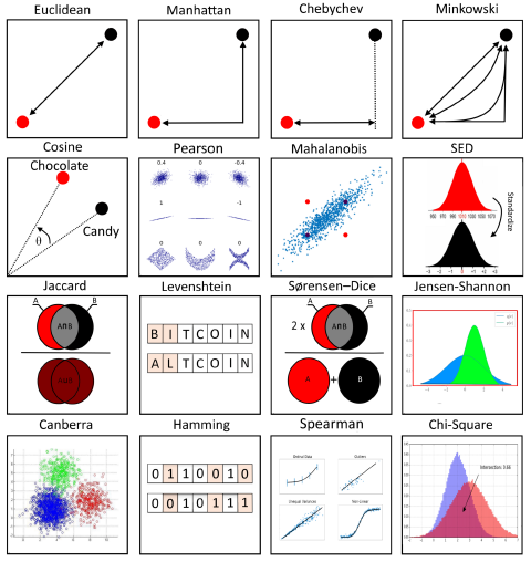 유사도(Similarity)는 두 개체 간의 유사성을 수량화한 것으로, 일반적으로 거리에 반비례하도록 그 측정 방법을 구성한다. 일반적으로 거리라고 하면 떠오르는 것이 두 점 사이의 거리의 표현 중 가장 대중적인 유클리디안 거리지만 그 외에도 개체의 속성에 따라 다양한 거리 측정법과 그에 기반한 유사도 측정법이 존재한다. 이 글에서는 그 중 일부를 정리해본다.