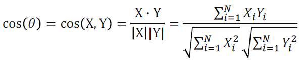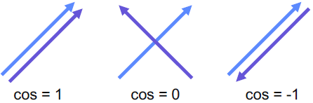 차원이 같은 두 벡터의 각도를 이용하는 유사도로 -1과 1 사이의 값을 가진다. 0은 서로 직각을 이뤄 관련이 없음을 의미하고 1에 가까울수록 유사하며, -1에 가까울수록 정반대(유사하지 않음)를 가리킨다.