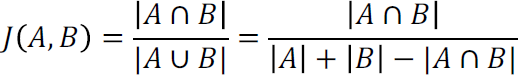 집합 개념을 사용한 유사도다. 두 집합이 얼마나 많은 원소를 공유하느냐를 0과 1사이의 실수로 표현한다. 1에 가까울수록 많은 원소(전체)를 공유하고, 0이면 공유하는 원소가 없음을 의미한다. 두 집합의 크기(차원)가 다르더라도 유사도를 계산할 수 있다는 장점이 있다. 두 문장이 공유하는 단어 수를 이용해 유사한 정도를 표현하는 데 활용될 수 있다. 다만 집합으로 접근하기 때문에, 특정 단어가 등장하는 빈도가 고려되지 않는다는 단점이 있다.