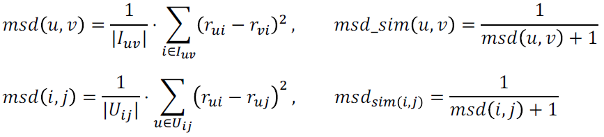 동일한 유저에 대한 아이템별 rating의 msd, 혹은 동일한 아이템에 대한 유저별 rating의 msd의 역수를 이용해 유사도를 표현하는 방법이다. 분모가 0이 되지 않도록 하기 위해 분모에 1을 더해주어 0과 1 사이의 실수로 표현 가능하고, 1에 가까울수록 유사하다고 볼 수 있다.