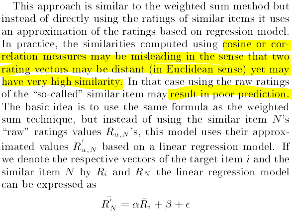 코사인 유사도의 경우 주어지는 벡터들의 norm이 다른 경우에, 유사도는 높지만 실제 거리는 먼 경우들이 존재할 수 있어 이에 대한 고려가 필요할 수 있다. (Item-based collaborative filtering recommendation algorithms(2010) 논문에서 이를 보완하기 위해 rating에 regression 기법을 적용한 것이 그 예다.)