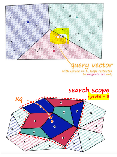 다만 이렇게 1개의 cluster만을 탐색하게 되면(nprobe=1) 위 그림처럼 query와 근접 이웃이지만 다른 culster에 포함돼 후보에서 제외될 가능성이 있으므로, nprobe의 수를 늘려 이러한 문제를 보완할 수 있다. 아래는 예시 코드.
