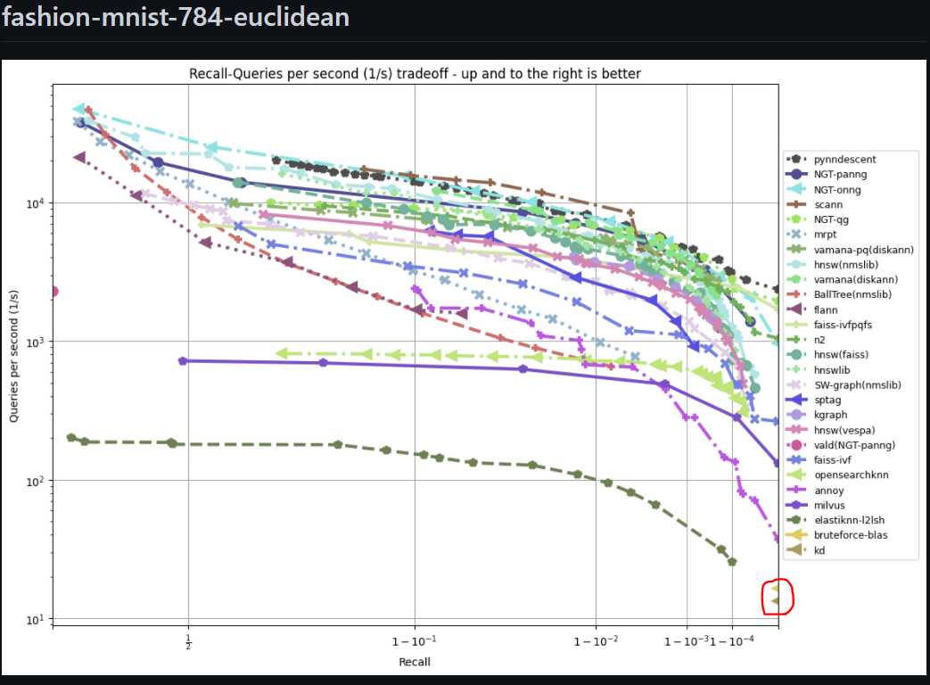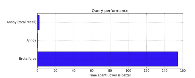 이렇게 ANNOY를 활용하면 주어진 벡터들을 이진 트리의 구조 내에 저장할 수 있고, 근접 이웃을 찾는 시행하게 되면 해당 벡터가 속한 subspace를 찾아가 그 공간 내에 있는 점들에 대해 이웃을 탐색하게 된다. 이때 이진 트리에서 특정 벡터를 찾는 데에 O(logn)의 시간 복잡도를 필요로 하고, 이웃 탐색 또한 적은 대상을 후보로 진행하기 때문에 아래처럼 브루트포스에 비해 압도적인 Query performance를 보여줄 수 있는 것이다.