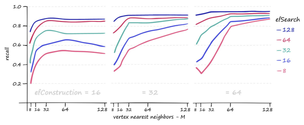 faiss 라이브러리를 사용해 이를 구현하면 M, ef_search, ef_construction 등이 대표적인 하이퍼 파라미터가 되는데, 이에 따른 정확도를 시각화하면 위와 같다고 한다. 아래는 예시 코드.