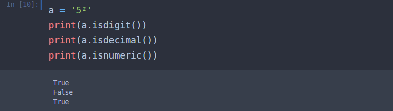 5) string.isnumeric() - 분수, 제곱근, 제급 등을 모두 포함해 실제 숫자이면 모두 True로 반환