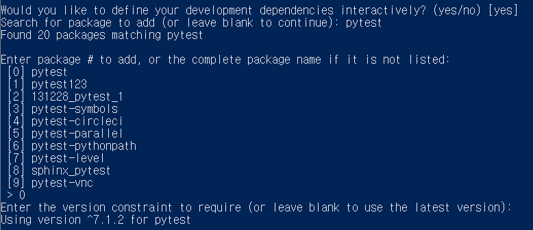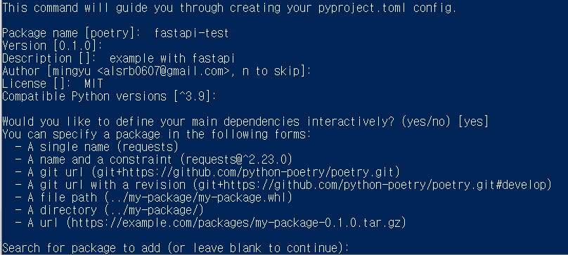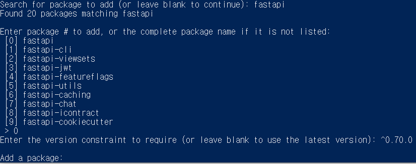 다음으로 "Would you like to define your main dependencies interactively?"에 yes라 답하면 interactive하게 패키지를 설치할 수 있다. 아래는 fastapi를 검색하고 원하는 0번을 목록에 추가한 예이다. 버전을 직접 지정할 수도 있고, 따로 지정하지 않는 경우는 가장 최신의 버전을 알아서 선택해준다.