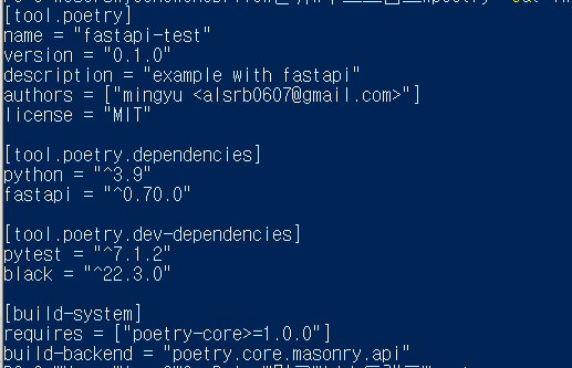 위처럼 개발용 dependency와 프로덕션용(main) dependency를 구분할 수 있다는 것도 poetry의 장점 중 하나다. init을 완료하면 pyproject.toml 파일이 생성되고, 그 내용을 확인해보면 init에서 설정한 내용들이 들어가 있음을 확인할 수 있다.