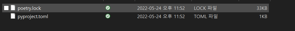 이처럼 poetry.lock 파일이 생성된 것을 볼 수 있는데, 이는 pyproject.toml에 명시된 패키지들을 설치할 때, 특정 패키지의 하위 패키지이거나 버전이 따로 기록되지 않아 최신의 버전을 받은 경우에도 추후의 사용자가 동일한 의존성을 가질 수 있도록 하기 위해 pyproject.toml가 업데이트 되는 시점마다 생성되는 파일로, github에 커밋하는 것을 규칙화하면 늘 모두가 동일한 의존성을 유지할 수 있다는 장점이 있다.