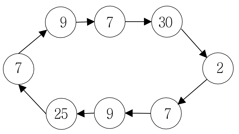 회전 초밥 음식점에는 회전하는 벨트 위에 여러 가지 종류의 초밥이 접시에 담겨 놓여 있고, 손님은 이 중에서 자기가 좋아하는 초밥을 골라서 먹는다. 초밥의 종류를 번호로 표현할 때, 다음 그림은 회전 초밥 음식점의 벨트 상태의 예를 보여주고 있다. 벨트 위에는 같은 종류의 초밥이 둘 이상 있을 수 있다.
