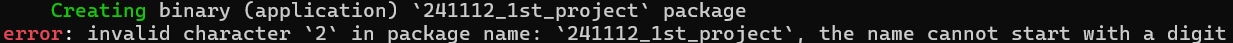 설치한 "cargo"가 자동으로 프로젝트를 구성해주는데, 프로젝트 이름은 digit으로 시작할 수 없다고 한다. (벌써 빡세다.. 숫자는 외않되?)
