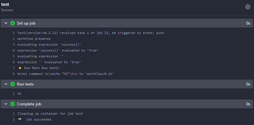 "jobs"는 실제 실행한 동작과 관계된다. "runs-on"의 경우, 해당 동작을 실행할 컨테이너를 띄울 이미지를 설정할 수 있다. 기본값으로는 ubuntu:latest 이미지가 활용되는 것으로 보이며, 커스터마이징도 가능하다. "self-hosted"는 별도 컨테이너를 띄우지 않고 push 등 동작이 발생한 로컬 환경에서 action을 수행하도록 한다. "steps" 하위에 여러 개의 "name"과 "run"을 순차적으로 동작하도록 배치가 가능하다.