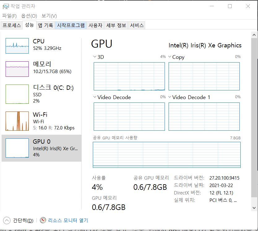 ctrl + shift + esc를 눌러 작업관리자 창을 열고, '성능' 탭에서 gpu 메모리가 할당되었는지를 볼 수 있다.