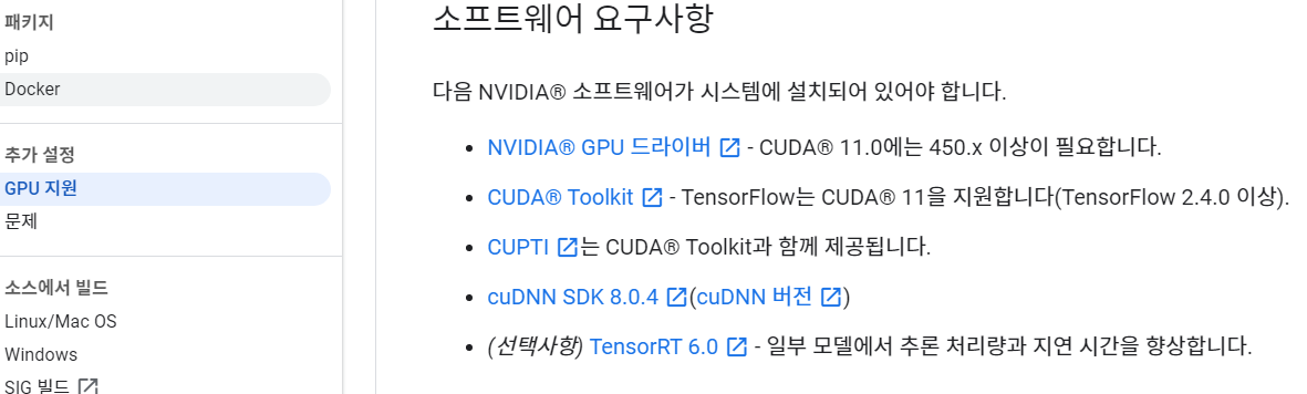 그 다음, https://www.tensorflow.org/install에 접속하여 버전 호환성을 확인한다. 먼저 왼쪽 windows 탭에서 tensorflow 2.3에 맞는 다른 소프트웨어들의 버전을 확인한다.