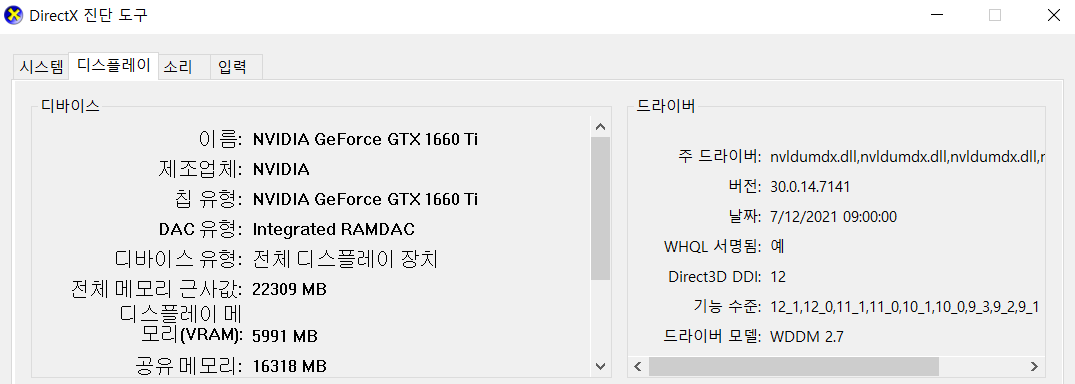 window의 경우 검색창에 dxdiag를 입력해 '디스플레이' 탭에서 그래픽 드라이버를 확인할 수 있다.