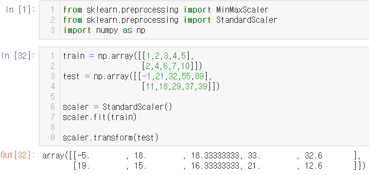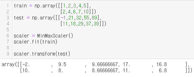train 데이터로 학습한 것을 바탕으로 test 데이터를 scaling한 결과다. 학습데이터와 테스트데이터를 원본데이터에서 나누어 사용하는 상황이라면, 가급적 나누기 이전에 scaling 한 뒤에 나누는 것이 좋다. 학습데이터와 테스트데이터가 본래 나누어져 있다면, 학습데이터에서 fit한 scaler를 그대로 테스트 데이터에 적용해야 한다.(테스트 데이터에서 별도로 scaling을 진행하면 안됨)